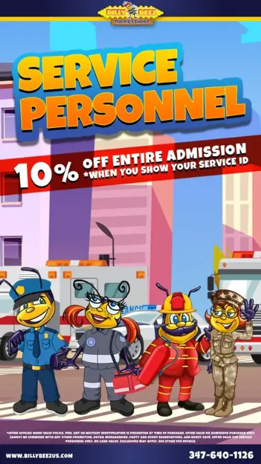 Service Personnel 10% off entire admission at Billy Beez when you show your service ID.