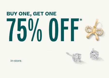 *Buy One, Get One 75% Off valid in stores from November 21, 2025 7:00 AM ET through November 26, 2025 6:59 AM ET. Second item purchased must be of equal or lesser value than the original item. Sale excludes piercing earrings, personalized jewelry, special offers, gift cards, prior purchases, extended service agreements, charitable Items and donations and needle piercing fees. Cannot be combined with any other offer. Offer may exclude certain items. Promotions, pricing, styles and availability may vary by store. Please see Jewelry expert for details.