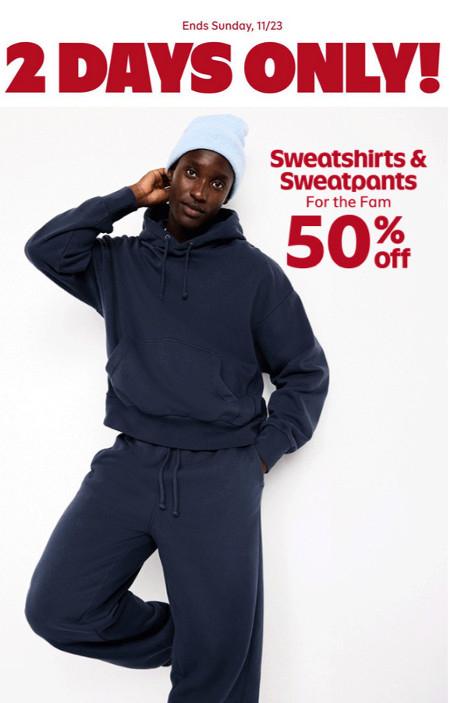 Old NavyShop in store today and get 50% off sweatshirts & sweatpants for the family.