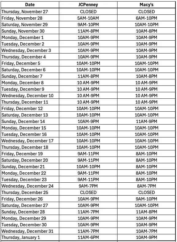 JCPenney's and Macy's Holiday Hours: